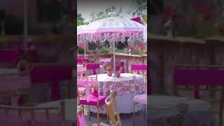 Draped in vibrant pinks and adorned with intricate gota work Mehendi décor @ Raj Bagh Palace, Jaipur