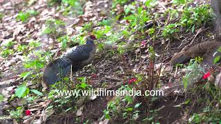 Female Kalij Pheasant camouflaged into forest leaf litter digs in to understorey for insects & seeds
