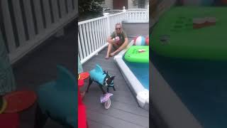 ¡Boston Terrier con un chaleco salvavidas contra tiburones está emocionado por entrar a la piscina!