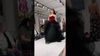 Black Prom Ball Gown with Red Lace Appliqués & Sequins on Bodice and Tulle Ruffle Skirt