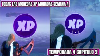 UBICACIÓN de TODAS las MONEDAS XP MORADAS DE SEMANA 4 TEMPORADA 4 FORTNITE -SUBIR RAPIDO a NIVEL 100