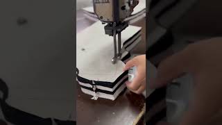 Garment factory worker operating specialized electric knife to precisely shape stacked striped #asmr