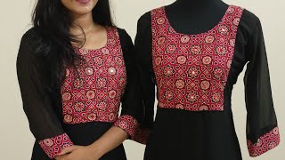 Plus size Slitted Kurtis with ajrakh patch with mirrorwork and handwork on yoke #samhithacollections