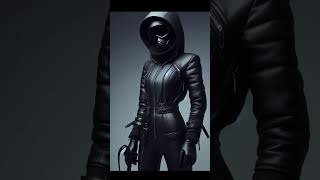 A girl in a black leather ski suit. Jumpsuit with hood, helmet and mask #shinyjumpsuit #inaspacesuit