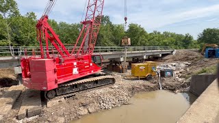 Manitowoc 10000A crane sets 58,450LB tubs in place for new Watco trestle. Kraemer CO Hallowell KS