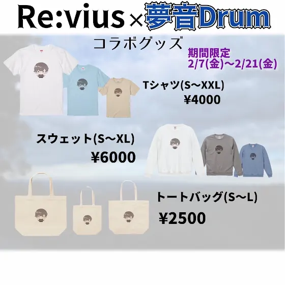 【お知らせ】夢音Drum×#Revius コラボグッズの販売です‼️ 2/7の18時~2/21の23時59分の期間限定販売、受注生産です! お手に取っていただけると嬉しいです! 応援よろしくお願いします!#コラボグッズ#PR #TシャツTシャツrevius.stores.jp/items/679af32ddbcf2503dc71859f?_g…スウェットrevius.stores.jp/items/679af36a9dd50303a86d161f?_g…トートバッグrevius.stores.jp/items/679af38da3a20c03bffd2807?_g…