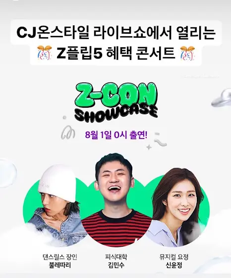 안냐하세욤 고gang님덜! 제가 오늘 자정 밤12시 CJ onstyle 라이브쇼에서 무대를 합니다!Galaxy Z flip5 사전예매와 혜택이 많으니 많은관심부탁드려욤❤️ 정말 팬이였던 민수님과의 콜라보 무대도 많관부,,