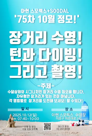 #10월 12일 #수달상회 정모요.. #장거리 #스타트 와 #턴 , #개인영법촬영 및 피드백으로 반별로 진행돼 알차고 알찹니다^^👍🙋♂️🏊♂️🏊🏻♂️🏊♀️👍수달상회 정모 신청하세요^^- 🔹일자 : 2025년 1ㅔ월 12일 일요일- 🔹주제 : ’장거리 수영! 턴, 다이빙, 촬영‘- 🔹장소 : #아현스포렉스 (서울시 마포구 마포대로 247, 아현역 3번 출구)- 🔹시간 : 08:00~10:00(이론수업 07:40분~ 15분간~)- ❤️레인 : 전체 레인 사용- 🙋♂️신청: 네이버카페 수달상회 해당 공지에 댓글달기^^==========================👐댓글 : 연번/성명/회비납부/면책동의/각오한마디📌참석자는 댓글로 참석 여부를 꼭 달아 주세요. 비회원, 지인은 참석자가 순번, 댓글을 달아 주세요. 부득이하게 못 달 상황이면 쥔장이나 참여 회원께~연락 주시길 바랍니다.🥇첫 참석자는 꼭 연락을 주세요.정모 단톡방 초대를 위함입니다.💙황샘-쥔장 : 카톡 ID yuleee#접배평자 #접영드릴 #배영드릴 #자유형드릴 #스타트 #자유형발차기 #자유형장거리 #장거리 #장거리수영 #접영장거리 #접영발차기 #평영발차기 #배영발차기#황쌤 레슨 문의❤️카톡 #오픈채팅방에서#수달상회를 검색하세요~https://#open.kakao.com/o/sXyneIbh