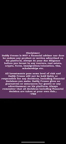 All investments pose some level of risk and Daddy Freeze will not be held liable or responsible for any decisions, including financial decisions you make. Daddy Freeze gives no guarantees or assurances for guests or any advertisement on his platform. Always remember that all decisions including financial decision are taken at your own riskā¦