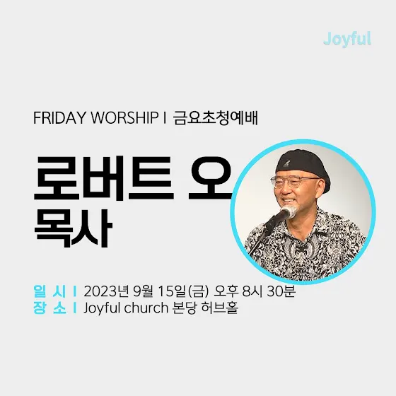 9/15 로버트 오 목사 금요초청예배9/15 금일, 로버트 오 목사님이 오셔서 말씀 전해주십니다.일시: 2023년 9월 15일(금) 오후 8시 30분장소: 조이풀 교회 본당 허브홀많은 참석 바랍니다.#joyful #joyfulchurch #조이풀교회