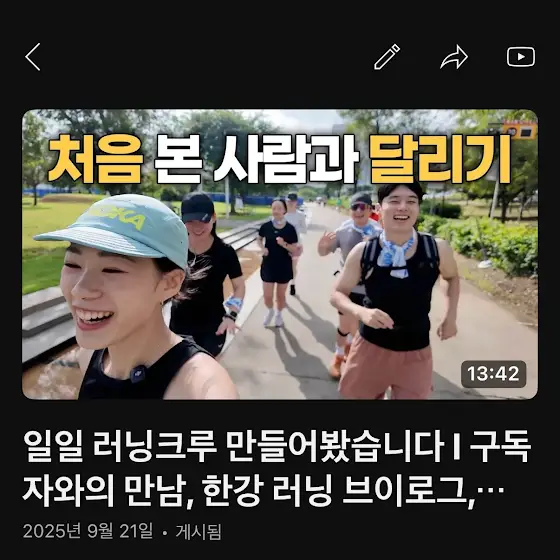 여러분~~! 저번에 제가 [한강에서 번개로 같이 3km 달리실 분?] 하고 올렸던 거 기억하시나요..?드디어! 구독자분들과 첫 오프라인 만남이 실현됐습니다! 🏃♀️💨👇 이 특별했던 하루가 궁금하시다면 영상 GO!https://www.youtube.com/watch?v=pEnBM...저 정말.. 이렇게 뵙는건 처음이라 엄청 떨렸는데요..! 걱정이 무색할만큼 너무 즐겁게 달리고 왔어요!솔직히 말하면... 처음엔 어색할 줄 알았는데 완전 대반전?! 사진에서 표정들이 다 방긋이에요ㅋㅋㅋㅋㅋ🤣서로의 이야기들도 나누면서 건강이라는 같은 관심사로 금방 친해지고 활기 넘쳤던 하루였네요ㅎㅎ영상 보시면 진짜 웃음 터지는 순간들이 가득해요! 함께해서 즐거움이 2배였답니다~~앞으로도 저는 여러분들과 이렇게 활기차고 생기있는 삶을 함께 만들어가고 싶어요! 다음에도 여러분과 같이 할 수 있는 일들을 생각해볼테니 저와 함께 건강해져요~~~!🥹💚