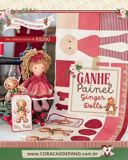 🎄✨ *Presentinho Especial de Natal no ar* ✨🎄Nas compras acima de R$290, você GANHA o Novo Painel Ginger Dolls 🍪💕 Faça 1 Bonequinha Linda e 3 Tag's Decorativas de Ginger 🥰 Fofo demais!Um Painel cheio de carinho para deixar sua decoração ainda mais doce neste Natal! 🎁🧵Aproveite essa oportunidade EXCLUSIVA Agora👉 coracaodepano.com.br/materiais-para-bonecar.html?c…⚠ *Campanha válida de e 02 a 07 de Outubro* ⚠️
