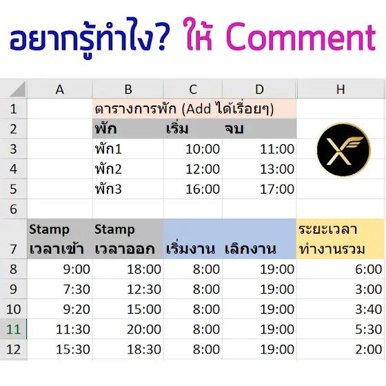 [มีกิจกรรมมาให้เล่น! จำนวน Comment มีผลต่อการแจกสูตร] ผมไปนั่งคิดสูตรคำนวณเวลาการทำงานรวมแบบหักเวลาพัก ให้มีความยืดหยุ่นพอที่จะ Add ตารางการพักได้เรื่อยๆ แบบอัตโนมัติได้แล้ว ใครสนใจอยากเรียนรู้วิธีทำ พิมพ์ Comment บอกได้เลย กติกา : ถ้ามีคน Comment ใน Post นี้เกิน 100 Comments (รวมกับในเฟส) ผมจะทำคลิปสอนฟรีใน YouTube นี้เลย แต่ถ้ามีไม่เกิน 100 ผมจะเอาคลิปไปอัปเดทในคอร์สออนไลน์ของผมใน SkillLane ให้คนที่สมัครไว้แล้วดูฟรีแทนครับ ^^