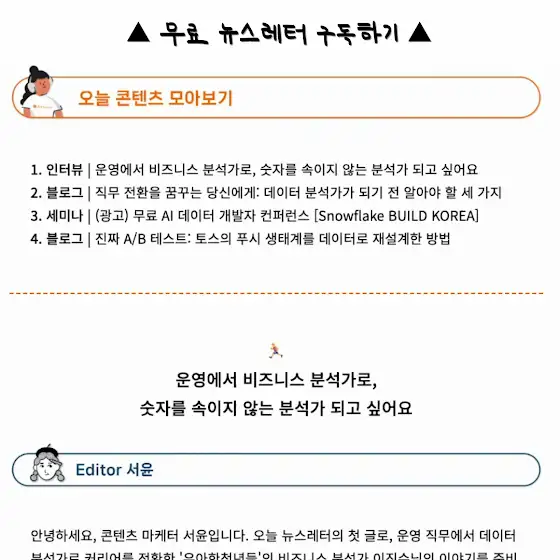 ❄️ (광고) 데이터리안 뉴스레터 12월 호가 발송되었습니다![12월 뉴스레터 미리보기]stib.ee/w5CK1. 인터뷰 | 운영에서 비즈니스 분석가로, 숫자를 속이지 않는 분석가 되고 싶어요2. 블로그 | 직무 전환을 꿈꾸는 당신에게: 데이터 분석가가 되기 전 알아야 할 세 가지3. 세미나 | (광고) 무료 AI 데이터 개발자 컨퍼런스 [Snowflake BUILD KOREA]4. 블로그 | 진짜 A/B 테스트: 토스의 푸시 생태계를 데이터로 재설계한 방법✅ 뉴스레터 구독하기 (무료)dub.sh/UlzxZZR아직 뉴스레터를 구독하지 않으셨다면,지금 바로 구독하고 데이터리안 블로그, 유튜브에 업로드 되는 데이터 분석 소식을 한 달에 한 번 받아보세요.올 한해도 데이터리안 뉴스레터와 함께해 주셔서 감사합니다.26년에도 알찬 콘텐츠로 돌아올게요 :)───────────────────