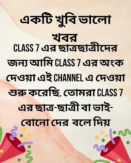 সবার জন্য একটি খুবই ভালো খবর আমি এই channel এর মধ্যে class 7 এর অংক দেওয়া শুরু করছি তোমরা তোমাদের ভাই বোন বা যেকোনো ছাত্র-ছাত্রী দের জানিয়ে দিও । তোমাদের class 7 এর ভিডিও সকাল 7:15AM এ আসবে।