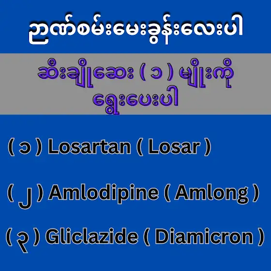 ဉာဏ်စမ်းမေးခွန်းလေးပါ။အောက်ပါတို့အနက်ဆီးချိုဆေး ( ၁ ) မျိုးကိုရွေးပေးပါ။( ၁ ) Losartan ( Losar ) ( ၂ ) Amlodipine ( Amlong ) ( ၃ ) Gliclazide ( Diamicron )#ဆီးချို #သွေးတိုး #သွေးကျဆေး #ဆီးချိုကျဆေး