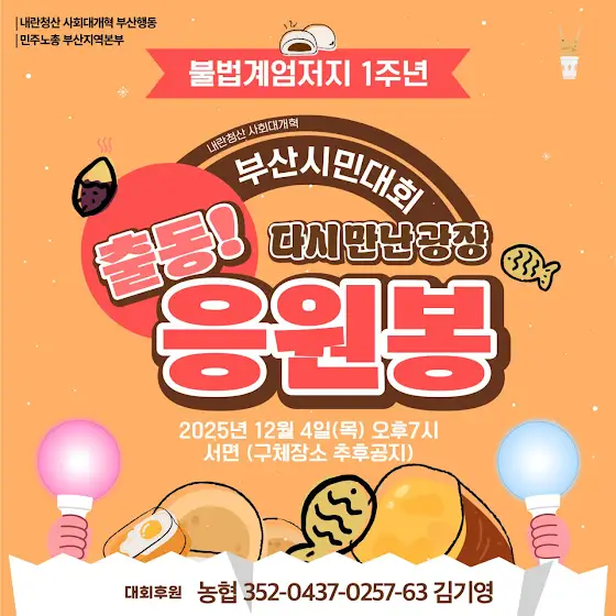 ⭕️ 불법계엄저지 1주년 내란청산 사회대개혁 부산시민대회 <다시 만난 광장, 출동! 응원봉>✅ 일시 : 2025년 12월 4일(목) 오후7시✅ 장소 : 서면 (구체장소 추후공지)✅ 주최 : 내란청산 사회대개혁 부산행동, 민주노총 부산지역본부