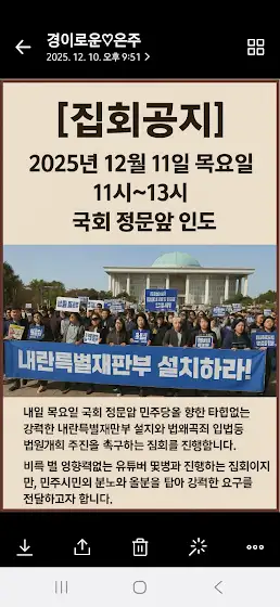 [집회공지]2025년 12월 11일 목요일 11시~13시국회 정문앞 인도내일 목요일 국회 정문앞 민주당을 향한 타협없는 강력한 내란특별재판부 설치와 법왜곡죄 입법등 법원개혁 추진을 촉구하는 집회를 진행합니다.비록 유투버 몇분과 진행하는 집회이지만, 민주시민의 분노와 울분을 담아 강력한 요구를 전달하고자 합니다.뜻을 함께하시는 분들 동참해 주시면 더 큰 힘이 될것이라 믿습니다.감사합니다^^