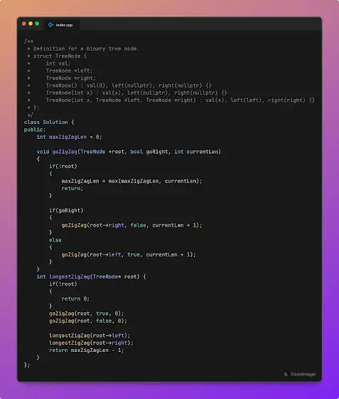 Solving new problems without referring solutions boosts confidence. Leetcode 1372 - Longest ZigZag path in a binary tree.