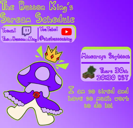 Finally another stream schedule as I have a very small amount of energy this week. Minecraft Skyblock Thursday, not sure what I'm doing but it'll be fun!