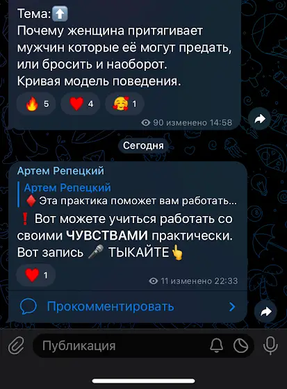 Те, кто мне писал в комментах «Ну это всё хорошо, что вы говорите, но а что с этим делать?». Вот, делайте. В телеграмме есть практический материал, которого нет на ютубе + буду выкладывать свои мысли туда на разные темы включая отношения. Есть практика которая помогает работать с чувствами.