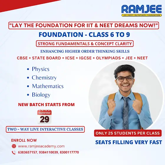 **Class 6 to 10 - JEE / NEET / Olympiads Foundation Classes****By RAMJEE Academy****🎯 Foundation Courses for Classes 6 to 9****⏰ Timing:** 7:00 PM – 8:30 PM**📍 Mode:** Online Live Interactive Classes**📅 Classes Start From:** **29th September****Why Choose RAMJEE Foundation Classes?*** Concept clarity for JEE / NEET / Olympiads* Expert faculty & structured curriculum* Doubt-solving sessions & mock tests* Recorded lectures for revision* Performance tracking & regular assessments**Fee Structure (per year)*** **Class 6:** ₹ 9500 + GST* **Class 7:** ₹ 10500 + GST* **Class 8:** ₹ 11500 + GST* **Class 9:** ₹ 13500 + GST**Limited Seats Available!**📌 **Register Now:** [www.ramjeeacademy.com](www.ramjeeacademy.com/)