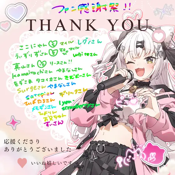 おハッピィス✨️ ファン感謝祭ありがとう!(><)ビンゴいっぱいできた!!ルーレットも楽しかったね♪明日はウルちゃんの配信だよーーー!仲良くしようね✧。・゚ナイスパもメンギフもありがとうございます✨️ THANKSカードです✧*。(ˊᗜˋ*)✧*。✧