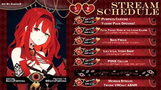 Hiya Hiya~! It's Daiya Fortuna! Your Monster Lady Casino Owner! Schedule for November 3rd - 9th! 2.0 MERCH LEAVES NOVEMBER 4TH! GRAB IT BEFORE IT'S GONE FOREVER merch.kawaentertainment.com/collections/daiya-fort… Art by: ElShira9