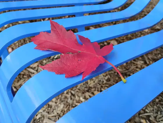 Pretty red leaf on a blue bench