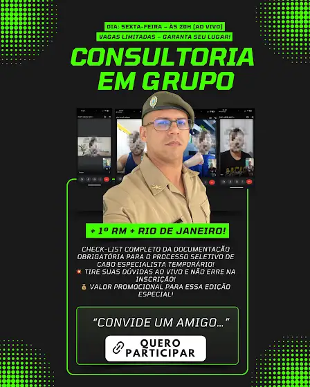 🚨 Esta é a consultoria em grupo exclusiva para quem vai se inscrever como Cabo Especialista Temporário na 1ª Região Militar (Rio de Janeiro).
