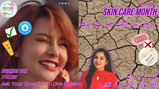 نومبر کے ساتھ ساتھ سردیوں کی آمد ہو چکی ہے۔ سردیاں ہماری جلد خاص طور پر چہرے کی خوبصورتی کو بہت متاثر کرتی ہے۔ کیا آپ جانتے ہیں کہ سردیوں میں بھی آپ خوبصورت نظر آ سکتے ہیں؟ کیسے؟ جانئے ہمارے لائیو یو ٹیوب سیشن میں کل شام 7 بجے. Channel: Skincare by Dr Aisha Ghias (DrAishaGhias) November is the Month of Skin Care. What we need to do to get Glowing Skin in Winters Join our Live Youtube Session on November 19, 2025 from 7 PM to 8 PM. Ask your questions and get answer from Dr Aisha Ghias