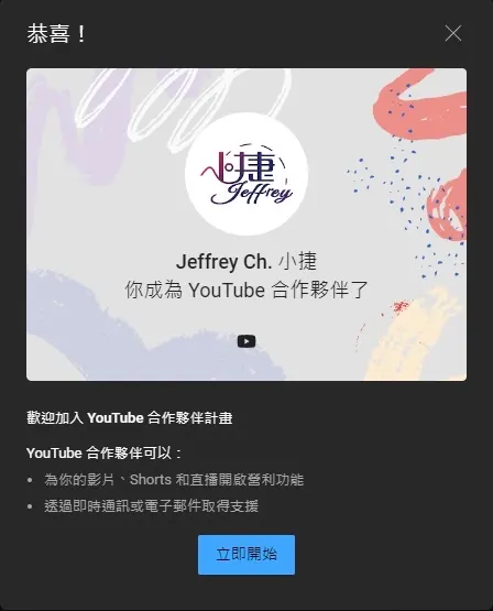 小捷我從去年九月左右開始剪蒂兒的歌回,原本只是想擴增自己YT的播放清單,沒曾想居然會有人來訂閱我,歌回影片沒有太華麗的特效或漂亮的字幕,但還是有觀眾來訂閱我給我鼓勵,這也讓我開始慢慢的想剪給你們看剪給你們聽,中間雖然斷更了一陣子但也終於在今天成為了YT合作夥伴,不是太大的里程碑可也算是種對自己的肯定,感謝各位觀眾這段時間的支持與鼓勵,今後雖然空閒時間較少但還是會努力產出,再請大家多多指教🙏