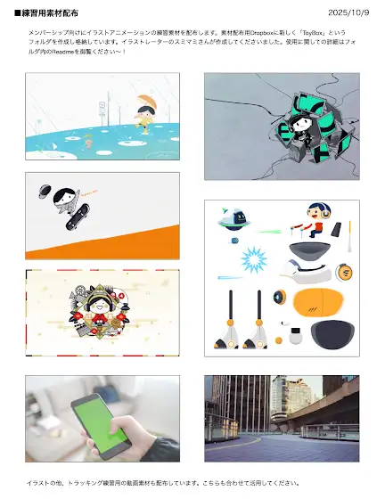 メンバーシップ向けにイラストアニメーションの練習素材を配布します。素材配布用Dropboxに新しく「ToyBox」というフォルダを作成し格納しています。イラストレーターのスミマミさんが作成してくださいました。使用に関しての詳細はフォルダ内のReadmeを御覧ください〜!