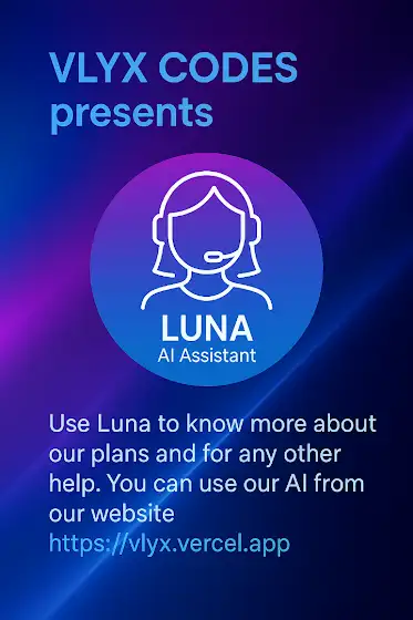 Meet Luna, the AI assistant by VLYX CODES.Use Luna to explore our plans or get instant help anytime.Try it now: vlyx.vercel.app/#LunaAI #VLYXCodes #AIAssistant #AI #SmartSupport #TechMadeSimple