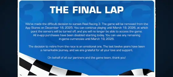 Hola amigos y familiares tengo malas noticias estoy triste porque el juego de carreras de Real Racing 3 se va amigos entonces ya medio sufrir otra vez se va 19 marzo 2026๐๐ฅ๐