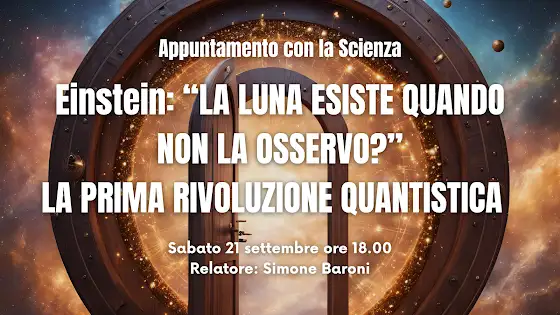 Ciao! Per chi vive a Bergamo o nei dintorni, siamo lieti di comunicarvi che Sabato 21 Settembre alle 18 si terrà lo spettacolo di scienza: EINSTEIN: “LA LUNA ESISTE QUANDO NON LA OSSERVO?” LA PRIMA RIVOLUZIONE QUANTISTICA presso il parco astronomico La Torre del Sole, in Via Caduti sul Lavoro 2 (ang. Via B. Locatelli), Brembate di Sopra (BG).