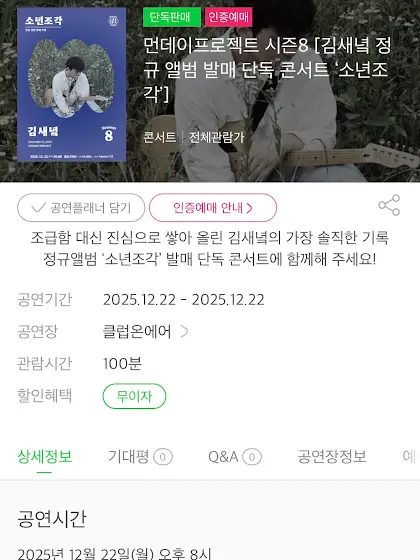 <티켓오픈> 김새녘 정규앨범 발매 기념 단독공연 ‘소년조각’ 티켓 판매 오픈! 재밌는 공연 기대해주세요! 아래 주소를 통해 예매 가능합니다. 문의 : 먼데이프로젝트 인스타그램 멜론티켓 : m.ticket.melon.com/public/index.html?utm_source=ig… 감사합니다.ㅂ