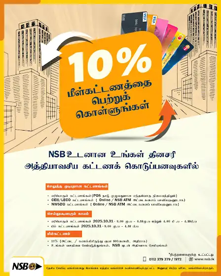 NSB டெபிட் அட்டைகள் மற்றும் டிஜிட்டல் வலைத்தளங்கள் மூலம் செய்யப்படும் அத்தியாவசிய கொடுப்பனவுகளுக்கு 10% மீள்கட்டணத்தை பெற்றுக் கொள்ளுங்கள்