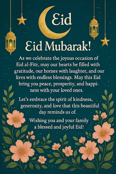 As we celebrate the joyous occasion of Eid al-Fitr, may our hearts be filled with gratitude, our homes with laughter, and our lives with endless blessings. May this Eid bring you peace, prosperity, and happiness with your loved ones.