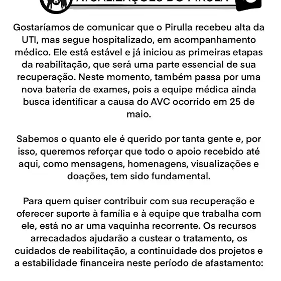 Força, Pirulla! 'Tamo contigo, cara, tenha uma recuperação formidável dentro de suas possibilidades, estaremos contigo sempre :)