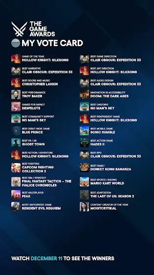 EVERYBODY GO VOTE THE CORRECT OPTION (preferably the game that has to do with bugs but idk...) I SHALL BE LIVESTREAMING THE GAME AWARDS DECEMBER 11TH.