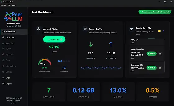 Just released: PeerLLM v0.10.0! Here's what's new: 0/ New dashboard UI (speed gauge, token telemetry, peer stats) 1/ New logs section 2/ Smart LLM compatibility detection 3/ Fixed GPU monitoring 4/ 60s model-test timeout 5/ Faster startup 6/ Debian + Arch Linux builds PLUS the new Hosts Portal: hosts.peerllm.com/ Monitor hosts, view network stats, download builds, manage your account. Check out full release notes here: blog.peerllm.com/.../12/07/announcing-v0.10.0.html