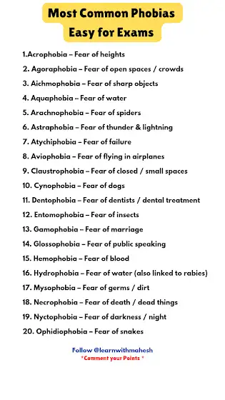 @learnwithmahesh2 📌 30 Most Common Phobias – Easy for ExamsAcrophobia – Fear of heightsAgoraphobia – Fear of open spaces / crowdsAichmophobia – Fear of sharp objectsAquaphobia – Fear of waterArachnophobia – Fear of spidersAstraphobia – Fear of thunder & lightningAtychiphobia – Fear of failureAviophobia – Fear of flying in airplanesClaustrophobia – Fear of closed / small spacesCynophobia – Fear of dogsDentophobia – Fear of dentists / dental treatmentEntomophobia – Fear of insectsGamophobia – Fear of marriageGlossophobia – Fear of public speakingHemophobia – Fear of bloodHydrophobia – Fear of water (also linked to rabies)Mysophobia – Fear of germs / dirtNecrophobia – Fear of death / dead thingsNyctophobia – Fear of darkness / nightOphidiophobia – Fear of snakesOrnithophobia – Fear of birdsPanphobia – Fear of everything (general fear)Pathophobia – Fear of diseasesPhonophobia – Fear of loud sounds / noisesPogonophobia – Fear of beardsSociophobia – Fear of social situations / peopleThanatophobia – Fear of deathTriskaidekaphobia – Fear of number 13Trypanophobia – Fear of injections / needlesZoophobia – Fear of animalslearnwithmahesh2.blogspot.com/