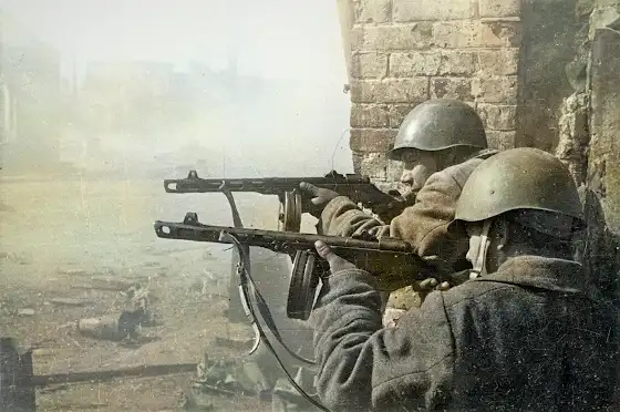 Бойцы А. Потапов и И. Семенов с пистолетами-пулеметам ППШ в уличном бою в Сталинграде. Место съемки: Сталинград. Время съемки: октябрь 1942 год. Автор: Эммануил Евзерихин.