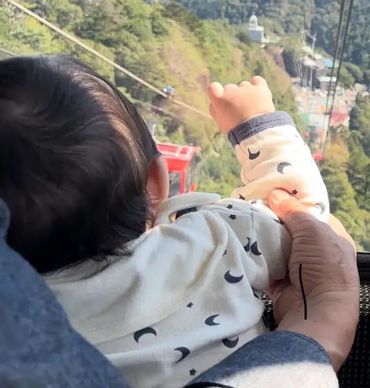 ロープウェイで下山中にすれ違うロープウェイに手を振らされるぶえ太です👋笑