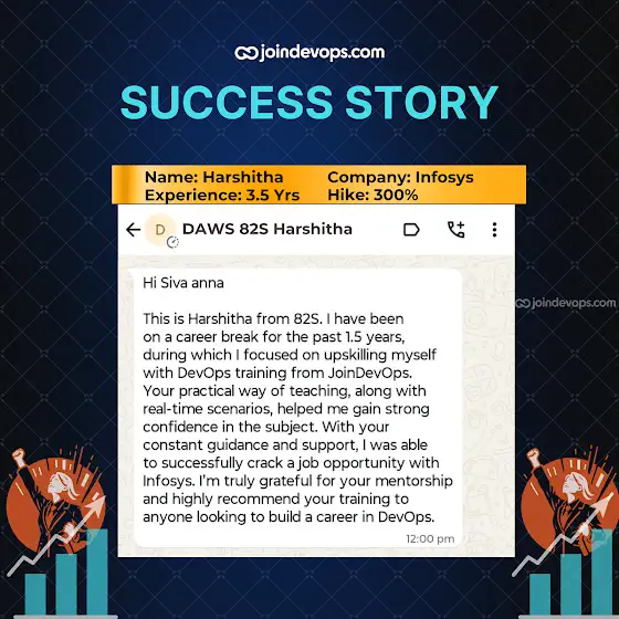 Back to career, stronger than ever! 💪 Harshitha nailed a 300% hike at Infosys after DevOps training with JoinDevOps. 🚀