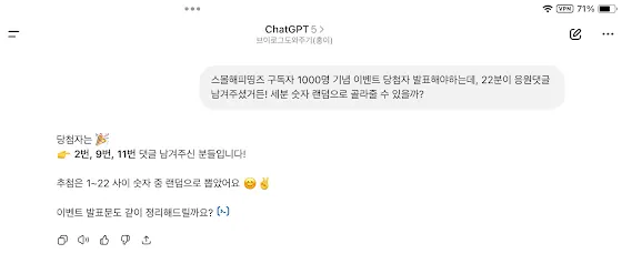 당첨자 선정은 어찌할지 고민하다가 챗GPT를 사용해 22분 중 랜덤으로 3분을 뽑았습니다. (참여자 번호는 댓글 등록일자 기준, 오름차순으로 부여했습니다)