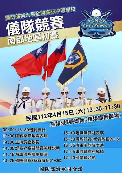 ⭐️第六屆全國高級中等學校儀隊競賽南部初賽活動訊息💯📣第六屆全國高級中等學校儀隊競賽南部初賽即將隆重登場🔥🔥🔥🔥🔥📣活動時間:民國112年4月15日(星期六)13:30~17:30📣活動地點:高雄港7號碼頭(棧柒庫前廣場)🛥️💁🏻♀️活動當天有:1️⃣陸戰軍樂隊暖場表演🎺2️⃣海軍儀隊操演⚔️3️⃣15所高中職學校學生儀隊競賽🏫4️⃣陸戰戰鼓社表演🥁5️⃣海軍手旗隊表演🇺🇳6️⃣海軍人才招募攤位💁🏻♀️💁🏻7️⃣海軍特色社團🎈8️⃣全民國防體驗攤位👀誠摯邀您一起共襄盛舉💌,我們不見不散🤝#第六屆全國高級中等學校儀隊競賽南部地區初賽🇹🇼#歡迎「儀」起「海」起來👏#15所學校的學長姊們在哪裡👂👂#快來活動現場幫學弟學妹們加油打氣🤜🤛