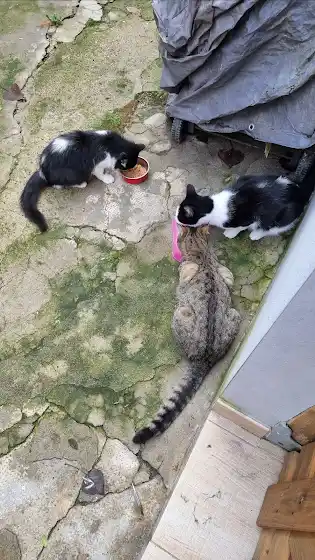 feeding my strays Bicro, Gufo and the little fluffy scrawny guy who joined recently and now he's growing bigger than the two 🥰🥰🥰gotta find'em a name (ㅎᴗㅎ )...