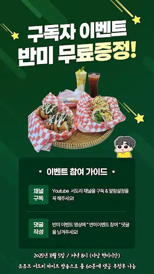 여러분 안녕하세요. 다낭보안관 서도리입니다!서도리 채널 9월 영상 수익금으로 작은선물 이벤트를 준비해 보았습니다.한시장 반미웨이 인기메뉴인 불고기반미 & 에그반미 총 60개를 우리 사랑하는 구독자님들께 추첨을 통해 무료로 나눔이벤트를 시행합니다!이벤트 참여방법은 서도리 채널 구독 & 알림설정 후밑에있는 반미 이벤트 영상 댓글에 " 반미이벤트 참여합니다 " 같은 참여 댓글을 남겨주시면 참여가 가능합니다! https://youtu.be/f3mQOJn3PVc?si=t-vo-...11월 5일 저녁 8시 (다낭 현지시간) 서도리 채널에서 라이브 방송으로 이벤트 당첨자 추천을 진행합니다!많은 분들이 오셔서 함께 이벤트 진행 해주시고 당첨자 축하 해주시면 진심으로 감사드리겠습니다!여러분 11월 5일 저녁8시 (다낭 현지시간) 모두 라이브 방송에서 만나요!! 깜언!
